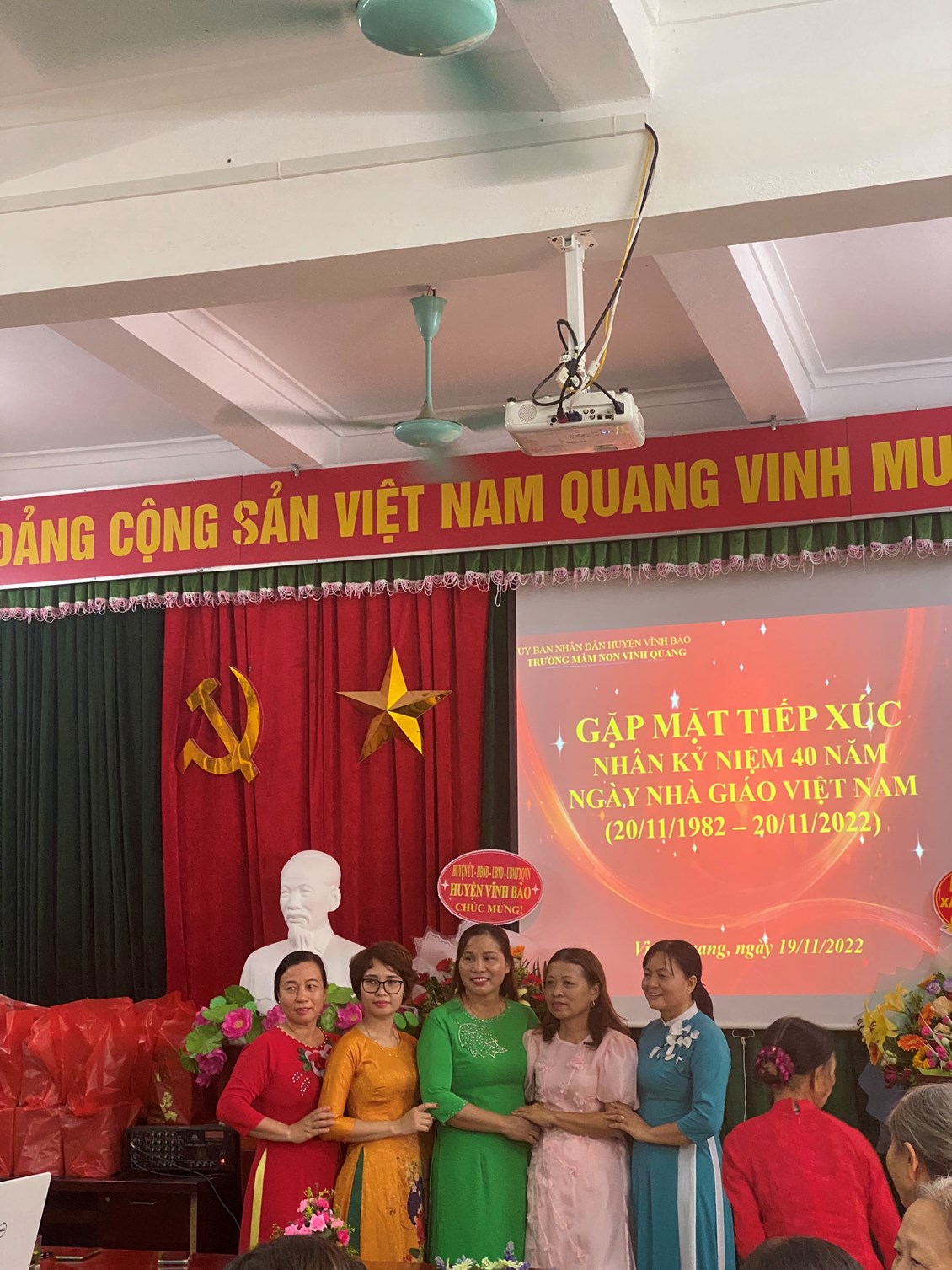 Tại buổi tiếp xúc, đại diện Ban giám hiệu trường Mầm non Vinh Quang đã ôn lại truyền thống cao đẹp của ngày Nhà giáo Việt Nam và biểu dương những cố gắng của tập thể cán bộ, giáo viên trong phong trào thi đua dạy tốt, học tốt của ngành, của địa phương.