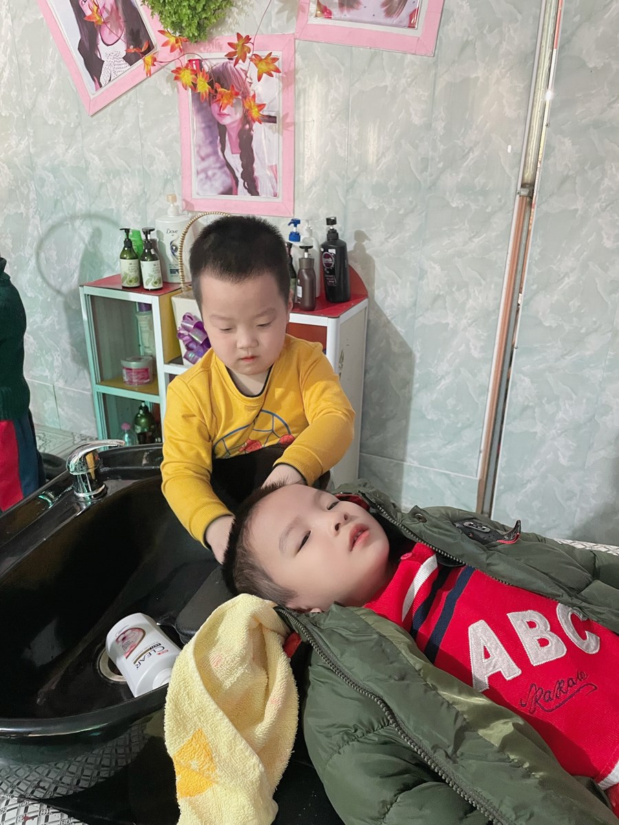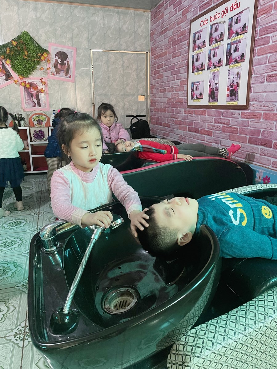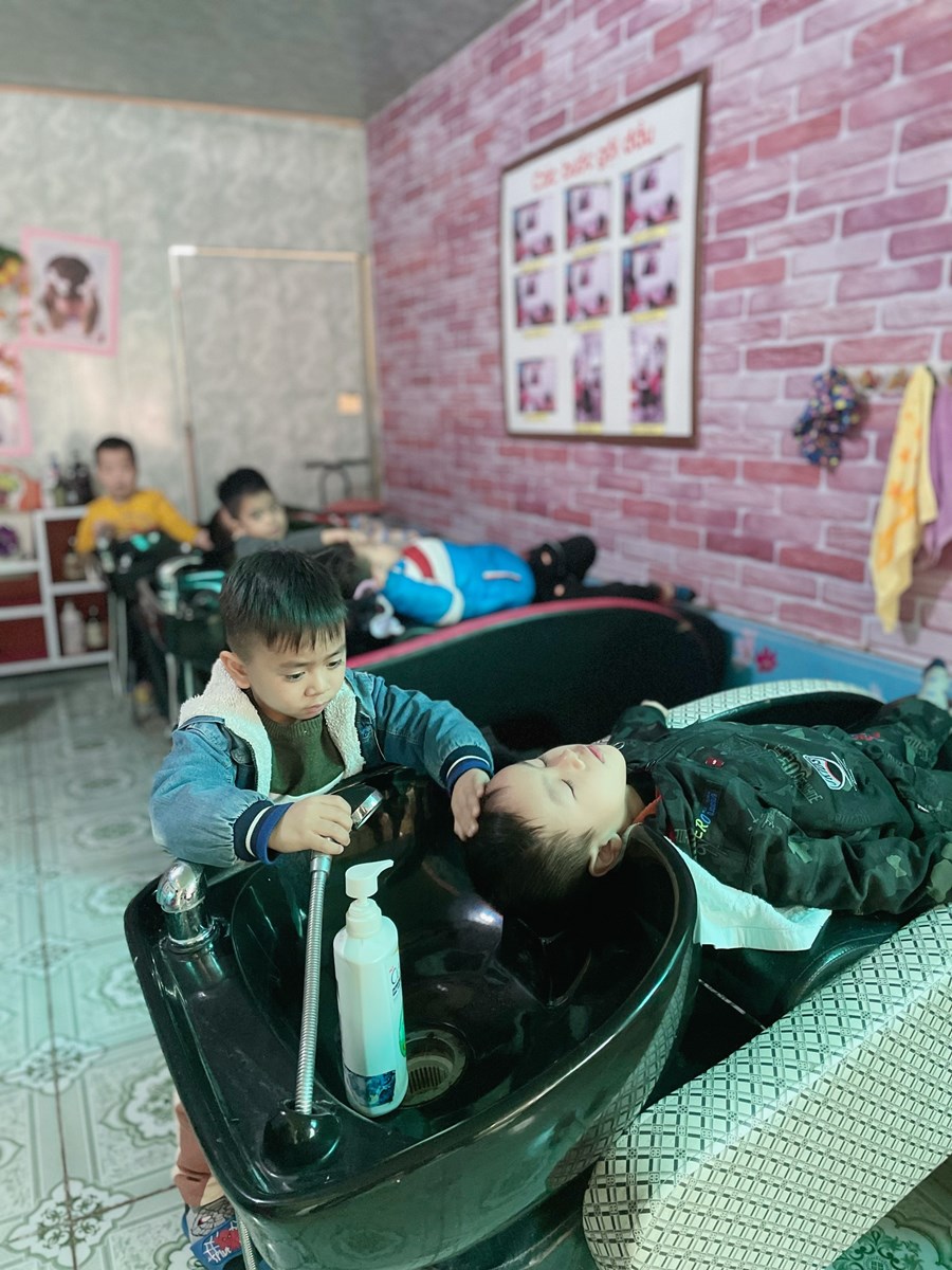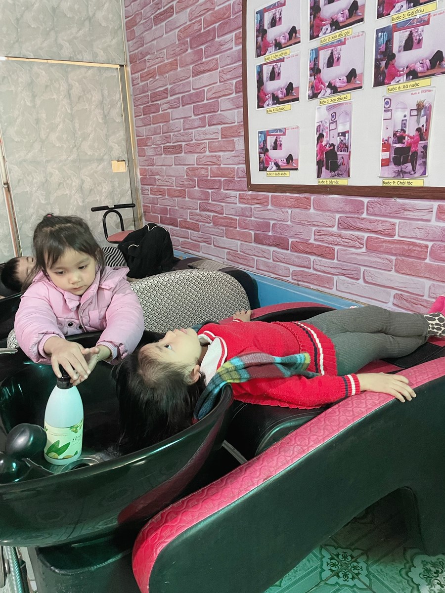 Bé trải nghiệm các ngành nghề gội đầu, tạo kiểu tóc