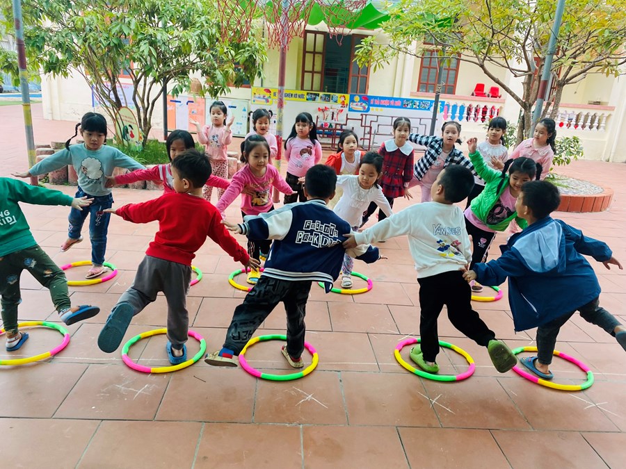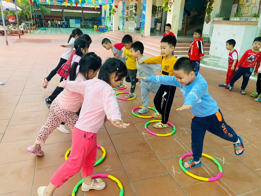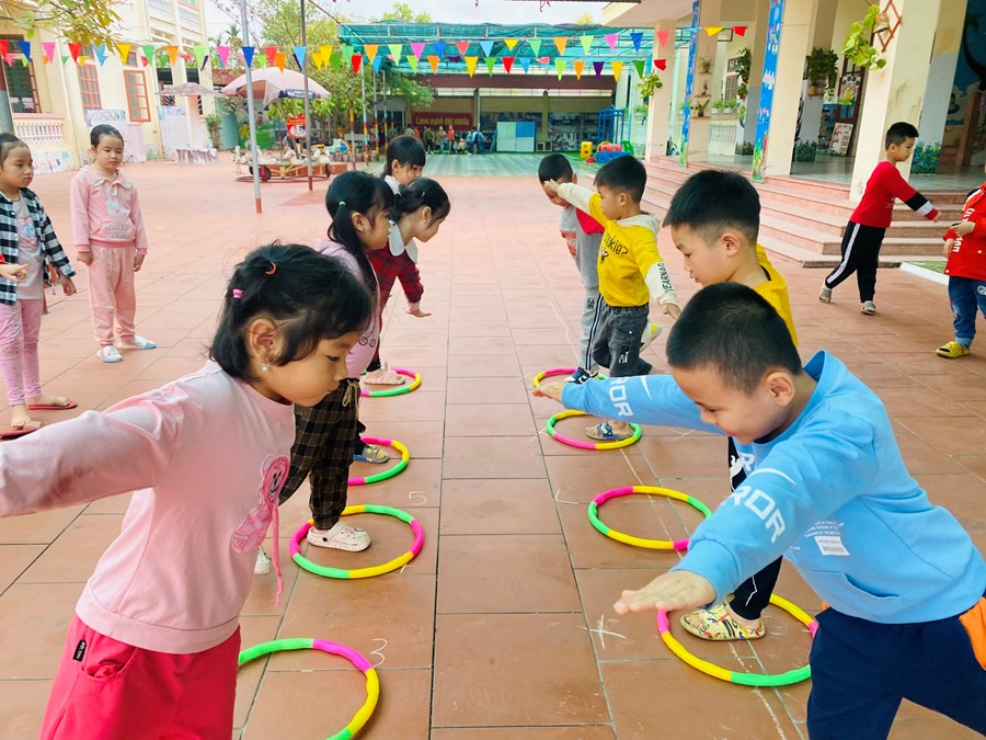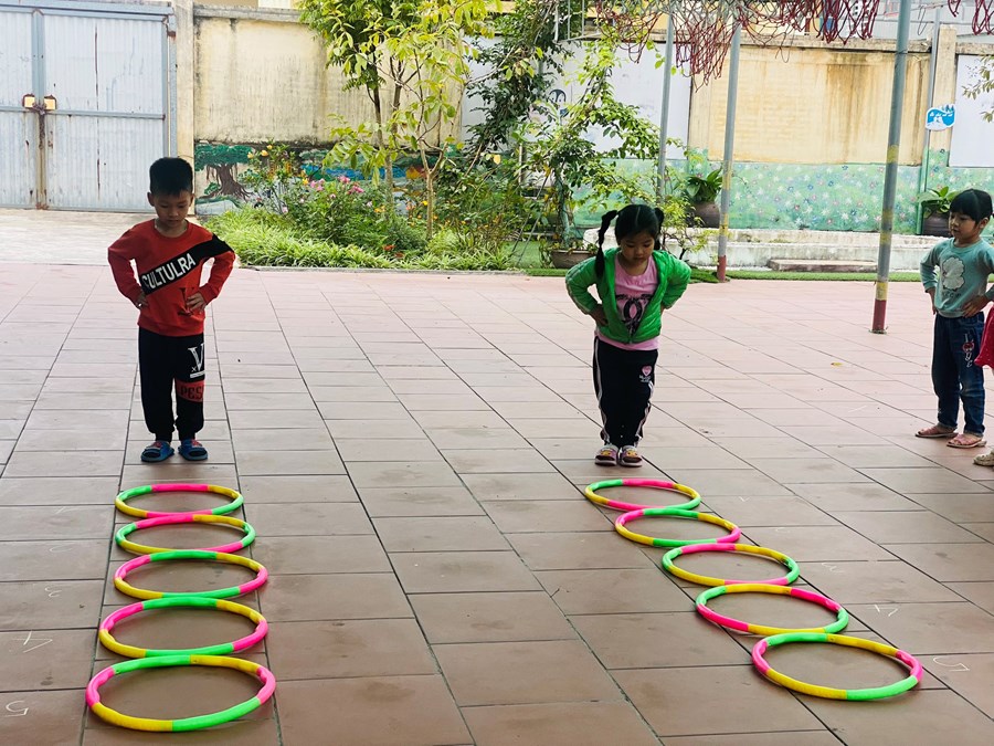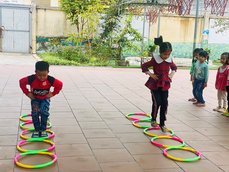 Hoạt động học bật liên tục qua 5 ô vòng cùng các trò chơi với vòng( giữ thăng bằng trong vòng, kéo vòng)