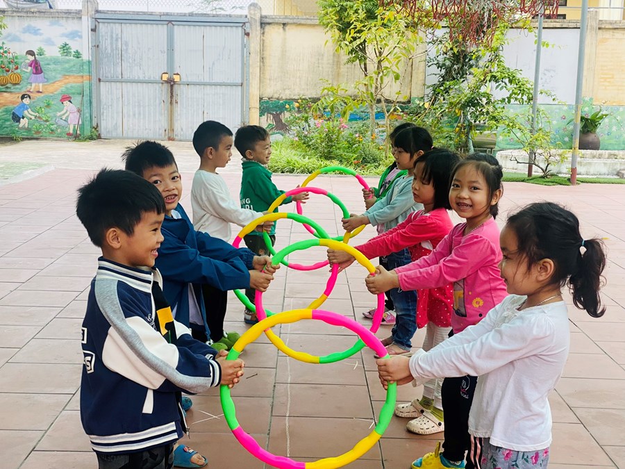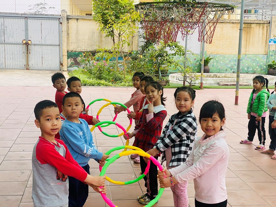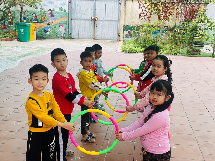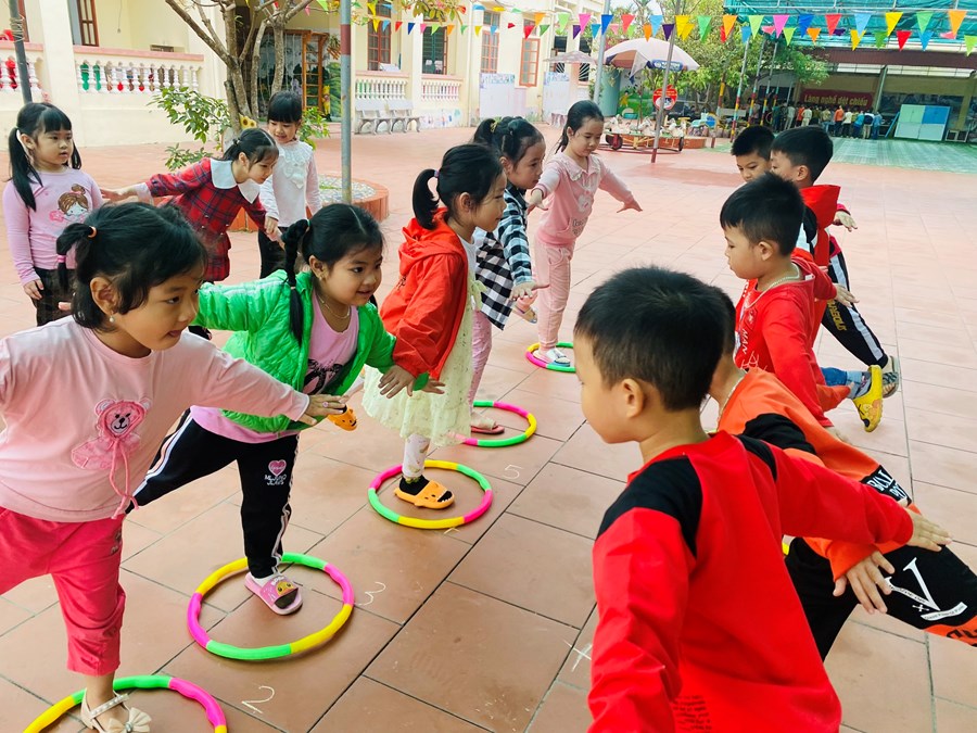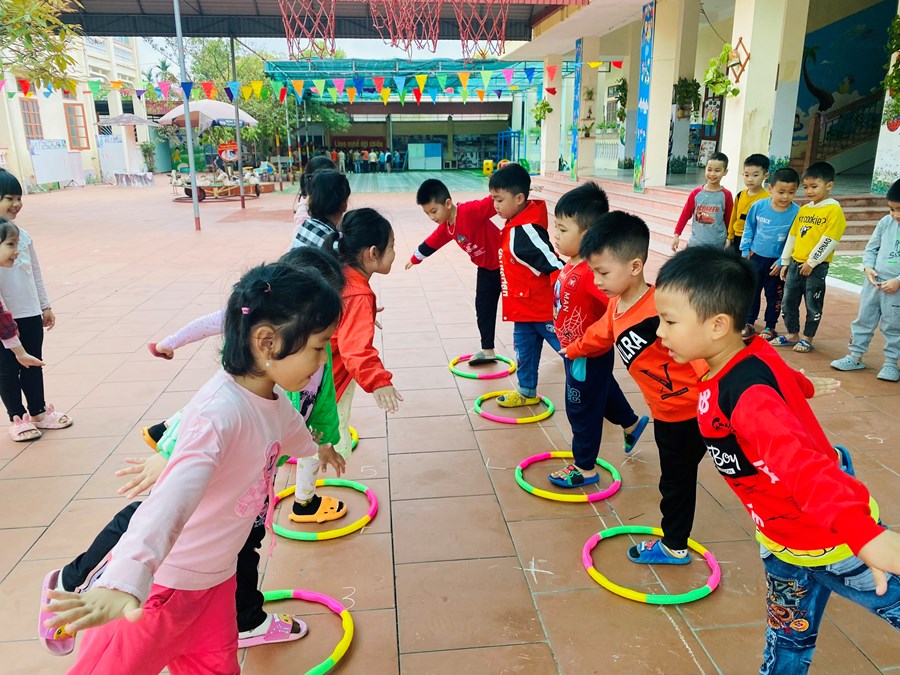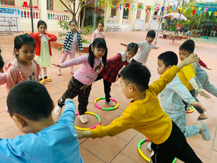 Hoạt động học bật liên tục qua 5 ô vòng cùng các trò chơi với vòng( giữ thăng bằng trong vòng, kéo vòng)