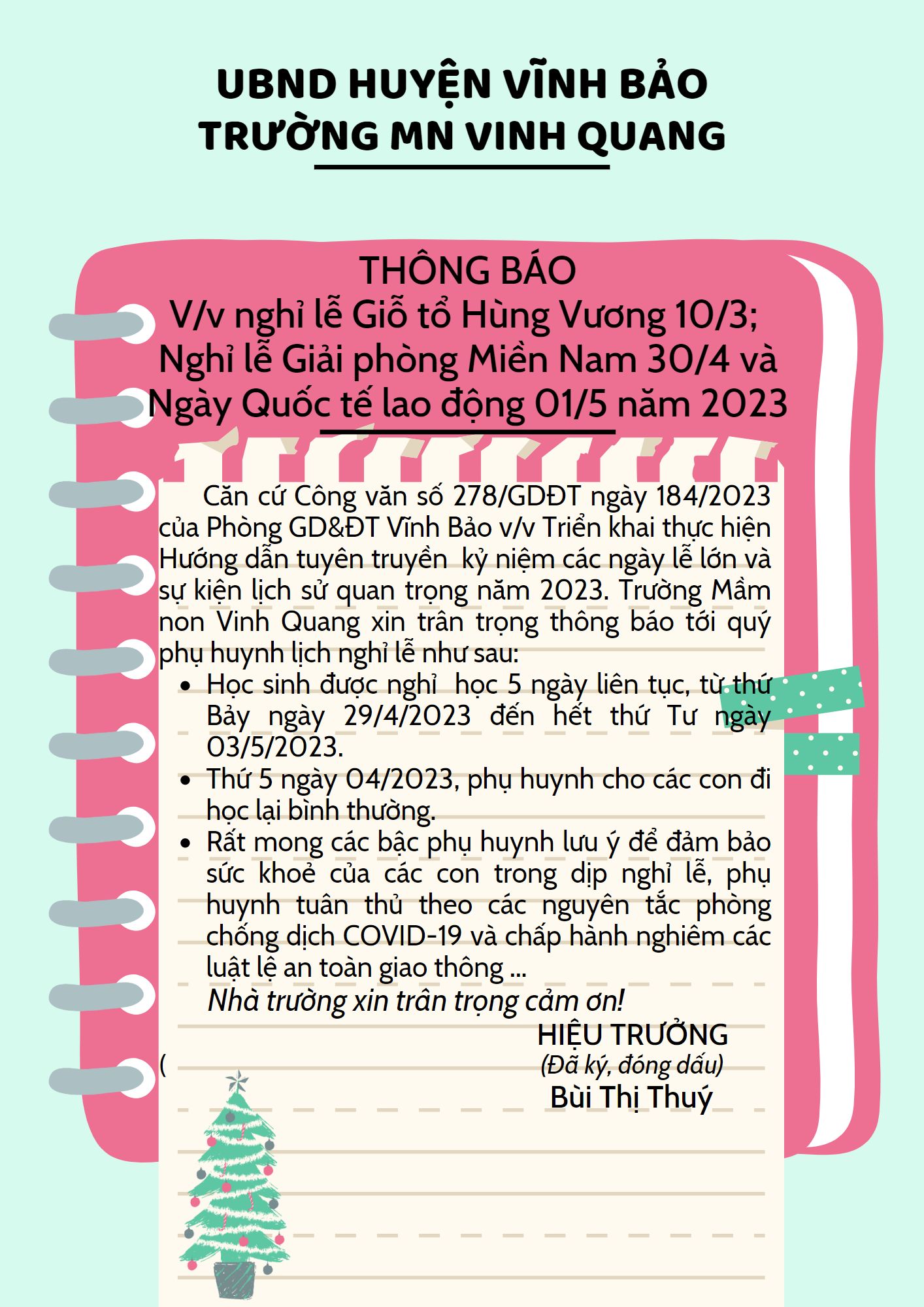 Căn cứ Công văn số 278/GDĐT ngày 184/2023 của Phòng GD&ĐT Vĩnh Bảo v/v Triển khai thực hiện Hướng dẫn tuyên truyền kỷ niệm các ngày lễ lớn và sự kiện lịch sử quan trọng năm 2023. Trường Mầm non Vinh Quang xin trận trọng thông báo tới toàn thể CBGVNV và quý phụ huynh lịch nghỉ lễ như sau:
